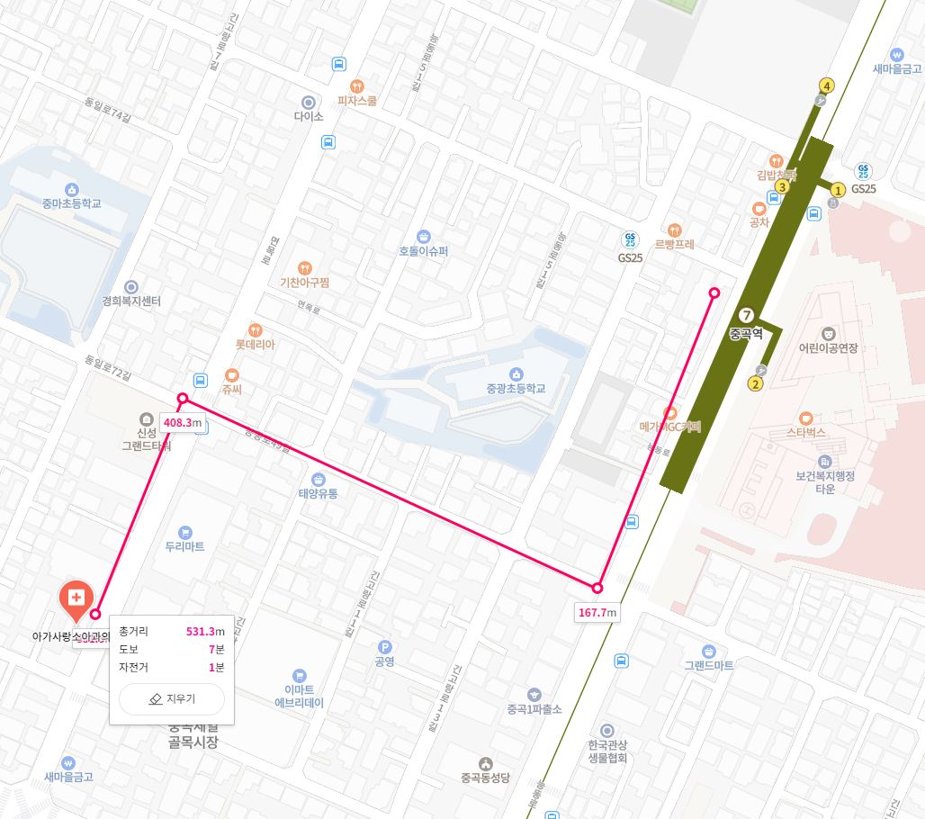 - 7호선 중곡역 3번출구에서 도보로 약 10분 정도 소요됩니다.