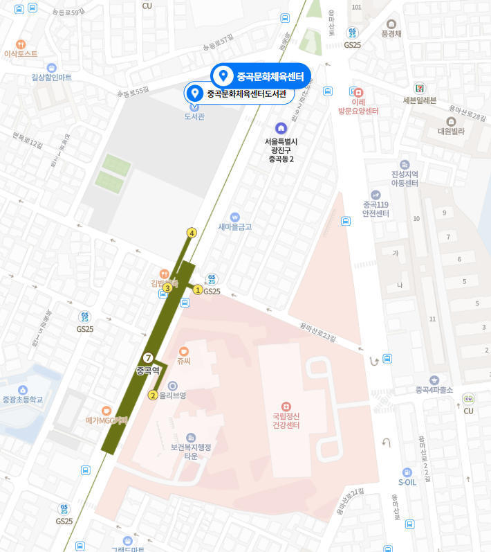 - 7호선 중곡역 4번출구 : 나오면 바로 보임. 직선거리 120여미터